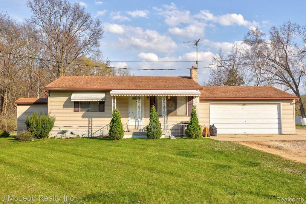 Welcome to peaceful country living! This charming 3-bedroom, 1-bath ranch offers 798 sq ft of comfortable living space, with a full, partially finished walkout basement ready for your vision. Sitting on a scenic 1.58-acre lot, the home features a covered front porch, spacious back deck, shed, and a cozy firepit—perfect for enjoying the quiet outdoors. Mature trees line the north side, providing natural privacy and a stunning rural backdrop. The 2-car attached garage includes a concrete slab entry via a gravel driveway off a paved road. Inside, you'll love the open kitchen with a custom-built island, a custom wall dresser in the primary bedroom, and the peace of mind from 8 included surveillance cameras with monitor. All appliances stay—just move in and make it your own!