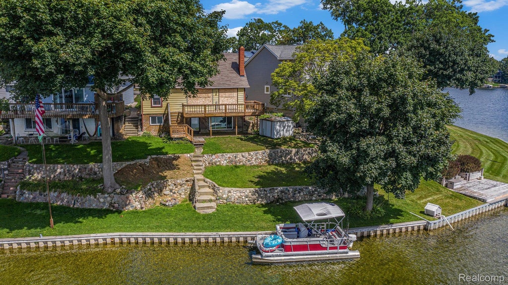 Opportunity to build your dream lake house on all-sports Lake Oakland! This property includes lake frontage, dock access, and a walkout basement with serious potential. The existing home is livable but is offered for the value of the land and vision for the future. Renderings shown are conceptual and reflect a proposed modern build designed for this lot. Highlights include joining the exclusive lakefront community on this secluded island, a 3-story home with full-width glass views of the lake, walkout lower level with multi-tiered terrace and fire-pit. Open concept living, 10’ ceilings, and sleek finishes plus optional dock, hot tub, outdoor kitchen, and lakeside lounge. Bring your builder or use the included designs. This is a rare chance to shape a legacy property in one of Oakland County’s most coveted lakefront neighborhoods. Please note that the first two images shown in the are conceptual renderings. Also listed as a proposed build MLS #20251031295. IDRBNG