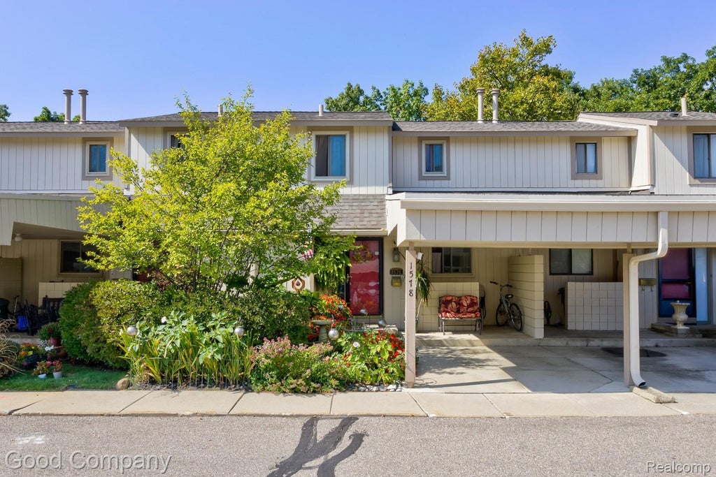 Lovely condo in Oakwood Park featuring a serene setting that backs to woods and the Clinton River, with a spacious layout and finished walk-out lower level. The home welcomes you with fantastic curb appeal, a charming garden, and convenient carport parking. Inside, a tile floor entry with a half bath leads to the bright open living and dining area, complete with sliding glass doors to a private balcony. The roomy kitchen offers hardwood floors, plenty of cabinet storage, and ample counter space. Upstairs, two bedrooms share a full bath, including a large primary with a walk-in closet and direct bath access. The lower level expands your living space with a cozy family room, highlighted by a striking stone fireplace, a second half bath, laundry, and a walk-out patio overlooking the lush green surroundings. New windows (2023) and new Furnace (2021). Enjoy the community house, pool, and peaceful river views just steps away. Welcome Home!