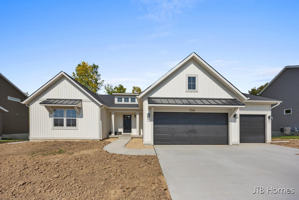 JTB Homes presents the Sequoia plan in Graymoor in Caledonia. This stunning ranch offers 3 main-floor bedrooms and 2.5 baths, including a spacious primary suite with a large walk-in closet. The open-concept living area features a cathedral ceiling, an electric fireplace, and stylish modern railing with metal spindles. The kitchen impresses with a center island trimmed in craftsman detail, solid surface countertops, wood toe kick, and a walk-in pantry. Enjoy added convenience with a main-floor mudroom and laundry. Step outside to a 16' x 12' deck with stairs. A 3-stall garage provides ample space. The daylight basement is partially finished with a full bedroom, bathroom, and rec room- ready for guests or extra living space. Buyer(s) eligible for 4.99% rate lock offered by seller. See documents for more details. Must be a full price offer.