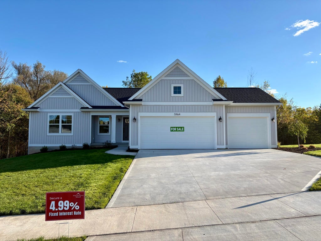 Interra Homes presents the Enclave floor plan. Beautiful ranch style home that offers a front entry leading into a spacious living room that includes an electric fireplace, dining area and kitchen with cathedral ceilings. Kitchen has large center island and walk-in pantry, perfect for entertaining! Kitchen includes wood toe kick and full tile backsplash. Private primary suite has bath with large walk-in closet. Two more large bedrooms and full bath, laundry, and mudroom off of 3-stall garage round out the main floor. Downstairs is a walkout basement, that includes a finished rec room, a finished bedroom and a full bathroom, along with plenty of storage space. Outside, you will find the finished landscaping, adding a nice touch to a new home. Estimated completion is late July.