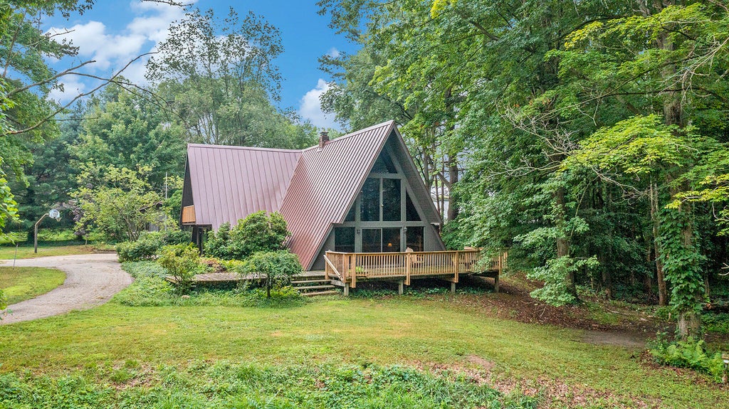 This fabulous A-Frame Home is Nestled on almost 2 acres. Private, Wooded lot overlooking Private Pond. Soaring Stone fireplace in spacious family room walks out to deck overlooking pond, Formal Dining with sliders to Patio. Separate workshop features potential office or studio space with 1/2 bath, includes Utility/Storage space with overhead door. Pole Building has concrete floor and electric and 10' sliding door. Home Warranty included. Home is in process of New Hook-in to Municipal Water & Sewer.A verbal report from Environmental Inspection has been received and the Septic system has failed. Sellers have conflicting reports on whether water/sewer is available at street. Answer to this question is necessary for sellers to make an informed decision on all offers based on the ability to hook-in to municipal system or replacement for the failed system. Being a long Holiday weekend it will be Tuesday before we are able to get these answers.