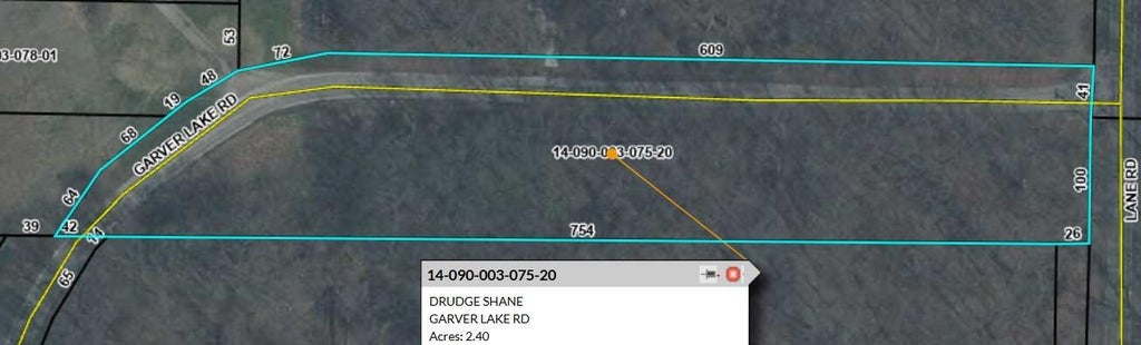 Wooded lot with over 1000'+ road frontage on 2 streets. Garver Lake Rd and Lane Rd. West end of property has some water views of Cobert Lake. Property has potential to be split into more than one parcel. Elevation changes offer building sits with possible lookout/walkout basement options.