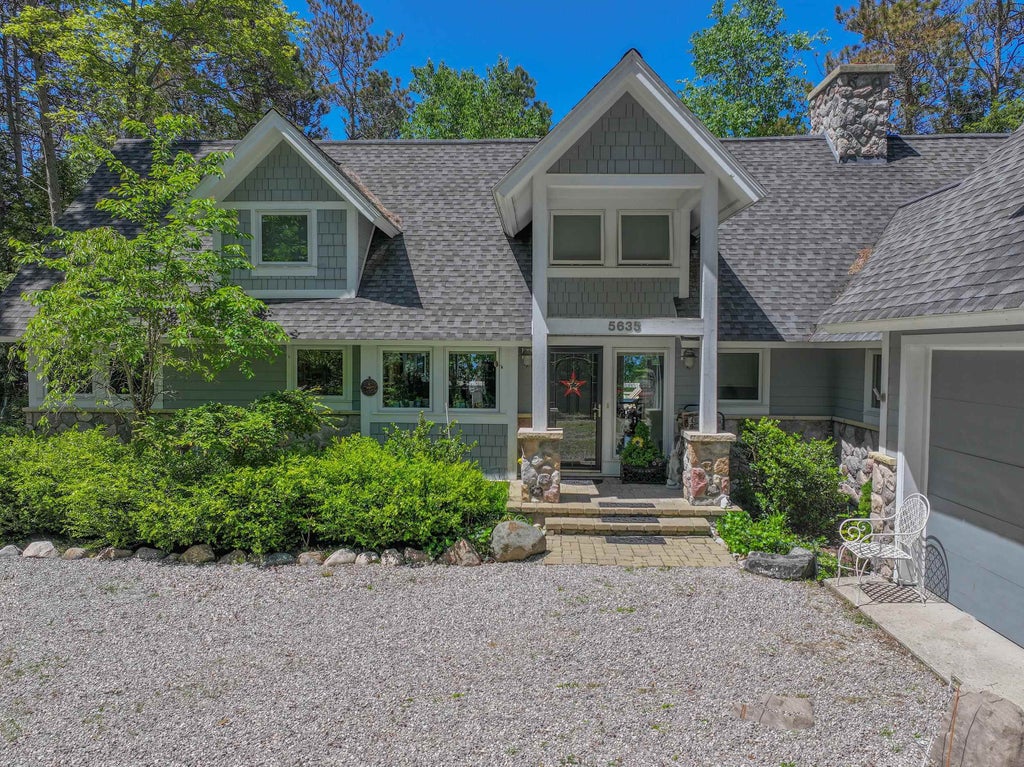 Escape the hustle and bustle to this hidden gem just 4 miles north of Leland on 150 feet of wide, pristine stretch of pure sand beach. Nestled seamlessly into its natural surroundings with breathtaking sunsets over the Manitou Islands. Imagine waking up to the sound of gentle waves and stepping onto your private beach. The house is a peaceful retreat nestled among lush greenery and attractive landscapes. The heart of this home is an open-concept living area anchored by a massive wood burning fireplace. Expansive deck, four seasons room-a sunlit sanctuary where you can soak in the beauty of changing seasons. Radiant heat ensures comfort year-round. Bonus room above the garage currently used as a studio was designed to be a third bedroom or bunkhouse. Large master suite. The guest house provides flexibility-use it as a cozy retreat for visitors, bedrooms 3 & 4 are in the guest house. This property blends with nature, offering a serene escape from the everyday and with hundreds of acres of protected natural area adjacent to your property, youll have a front-row seat to Michigans untouched beauty.
