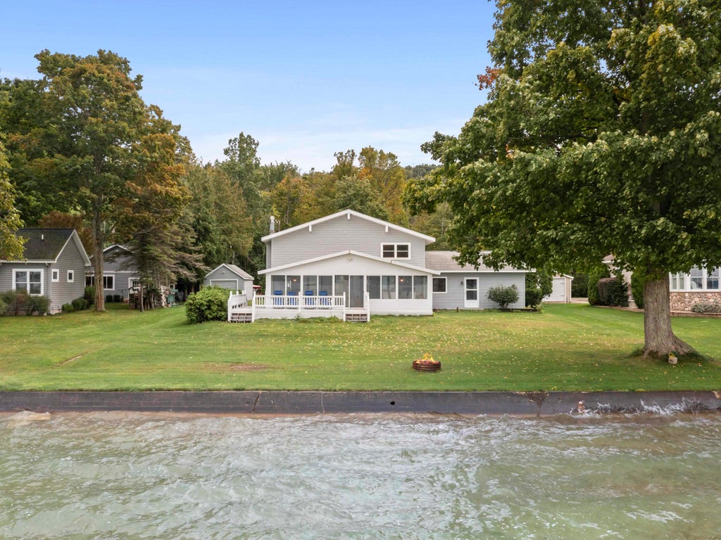 Waterfront 3 BR, 2 BA home with 100 ft private frontage on all-sports Big Platte Lake near the Sleeping Bear Dunes National Lakeshore in Benzie County. Sweeping views across the entire lake from this quiet setting off the main road. Hard sandy-bottom lakefront with seawall and concrete ramp. Year-round home is turnkey with furnishings and features a lakeside sunroom, all new windows, new kitchen and appliances, and new maintenance free Trek decking. The living room cathedral ceiling rises above a fireplace with a WIFI controlled Majestic furnace insert for whole house heat upon demand. An upstairs loft lends bonus sleeping space. Refresh the interior with your personal touches. The 2-car, insulated, attached garage has a kitchen for summer get-togethers. Store the boats and yard equipment in the detached garage. Nice level front and back yards for recreation. Big Platte Lake is known for boating, swimming and fishing. Kayak down the Platte River to Lake Michigan from here.