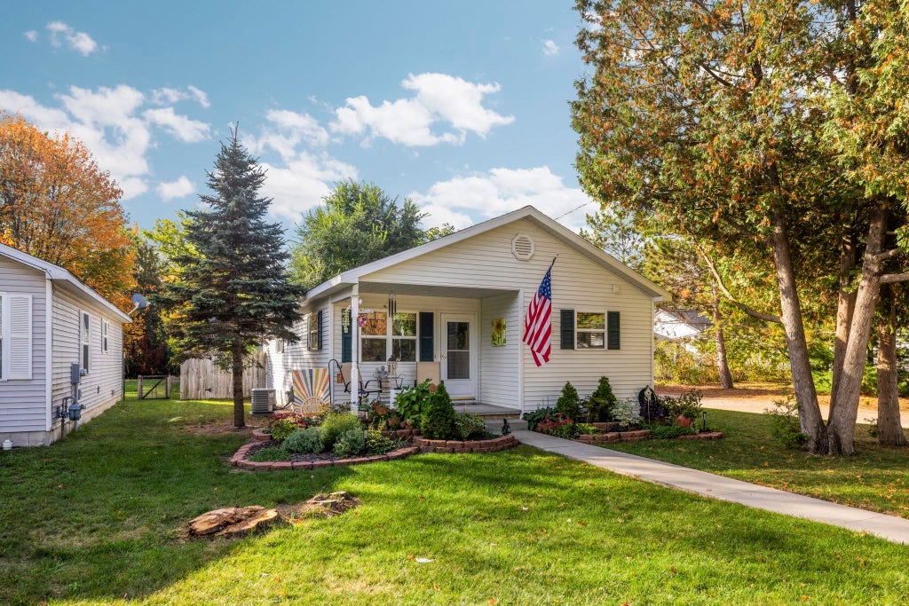 Tucked away on a peaceful street just minutes from downtown Traverse City, this updated 2-bedroom, 1-bath bungalow blends comfort and convenience. The open layout features vaulted ceilings, hardwood floors, and plenty of natural light. The kitchen shines with a 2024 refresh that includes quartz countertops, a new backsplash, and freshly painted cabinets. Both bedrooms have new carpet, and the home offers central air for year-round comfort. Step outside to a private fenced backyard, beautifully landscaped and perfect for relaxing or entertaining. The spacious two-car garage features a 10-foot door, ideal for storing larger vehicles or recreational toys. With a newer concrete driveway, updated storm doors, and thoughtful improvements throughout, this home is truly move-in ready and full of charm.